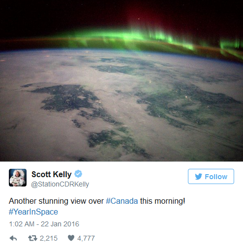 Từ tháng ba năm 2015, Kelly đã sống trên Trạm vũ trụ ISS như một phần của nhiệm vụ One Year Mission. Ông và phi hành gia người Nga Mikhail Kornienko sẽ dành 365 ngày trên quỹ đạo để xem xem cơ thể con người phản ứng với một khoảng thời gian dài trong vi trọng lực như thế nào – nghiên cứu này có thể giúp các cơ quan chuẩn bị cho các nhiệm vụ Sao hỏa trong tương lai. (Anh em sinh đôi của Kelly, Mark, đang làm nhiệm vụ kiếm soát dưới mặt đất.)