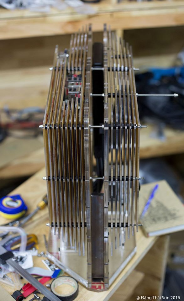 Để thực hiện thành công thì anh Sơn đã phải rất cố gắng đi cắt ghép CNC, Laser nhiều lần bởi còn phải lắp thử, chưa ưng lại đi chỉnh lại... Tiếp theo đó khi đã vừa ý thì phải sơn sửa lại cho đẹp mắt, rồi mod thêm đèn LED để hệ thống trở nên lung linh bắt mắt.