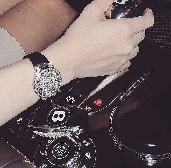 Nếu như Hà Hồ phô trương thanh thế với vương miện thì Huyền Baby lại chơi trội với đồng hồ kim cương, túi Dolce&Gabbana và giày cao gót Gucci.