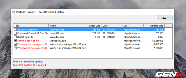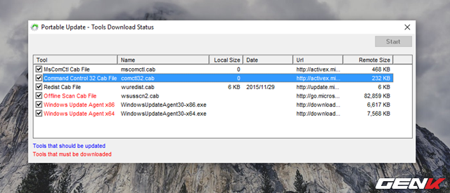 Giao diện Portable Update xuất hiện, công cụ sẽ tự động kiểm tra và nhắc bạn tải về một vài tập tin cần thiết cho việc tìm kiểm, tải và cài đặt cập nhật Offline cho Windows. Bạn hãy đánh dấu vào tất cả và nhấn Start để bắt đầu tải.