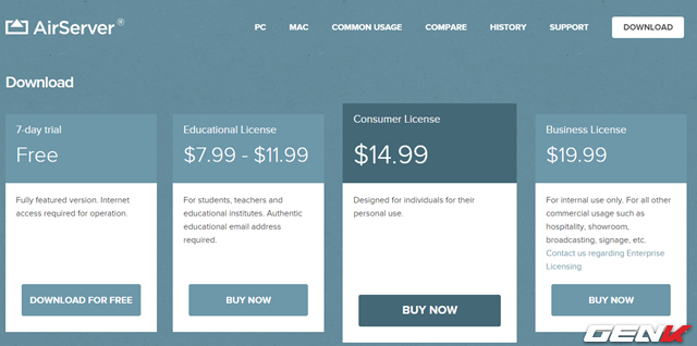 Tải về AirServer tại đây, sau đó tiến hành nhấn vào lựa chọn Download for Free để tải về tập tin cài đặt AirServer với 7 ngày dùng thử miễn phí.