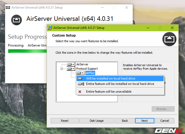 Sau đó chờ vài giây để được đưa đến giao diện cấu hình cài đặt chính. Ở mục Custom Setup, bạn hãy thiết lập cho phép cài đặt 2 thành phần AirPlay và Miracast vào hệ thống để giúp nhận diện thiết bị Apple được tốt hơn.
