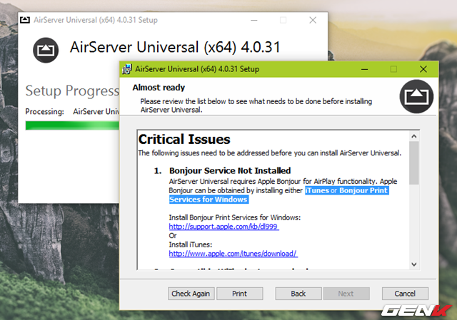Tiếp theo, bạn một thông báo lỗi sẽ xuất hiện. Ở đây lí do bạn không thể tiếp tục là chưa cài đặt iTunes vào máy tính. Do đó, cách khắc phục đơn giản chỉ là tải và cài đặt iTunes vào máy tính, sau đó khởi động lại trình cài đặt AirServer.