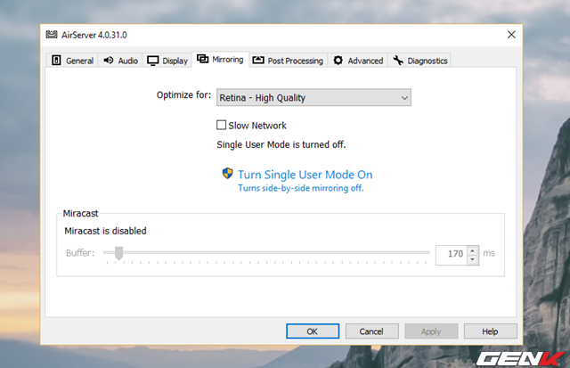 Do đó, nếu muốn trải nghiệm tính năng này, bạn phải có một chiếc AppleTV và một thiết bị chạy hệ điều hành iOS. Tuy nhiên, bạn vẫn có thể trải nghiệm tính năng này ngay trên Windows với sự trợ giúp của công cụ có tên là AirServer. Và với AirServer, máy tính Windows của bạn sẽ như là một chiếc AppleTV thực sự thông qua kết nối Wifi, nếu bạn quan tâm, hãy tham khảo cách sử dụng như sau.