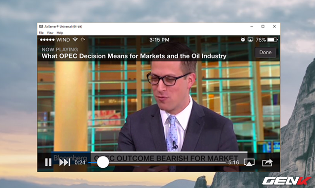 Bây giờ, sau khi cấu hình xong. Bạn chỉ việc mở iPhone của mình lên, bật đoạn video hay âm thanh mà mình muốn truyền sang máy tính thông qua tính năng AirPlay là xong.