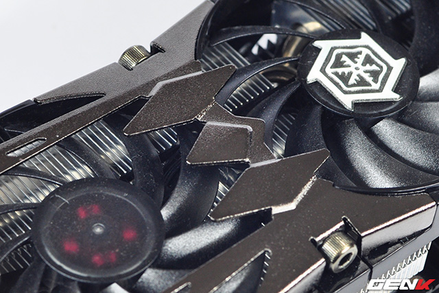 2 phía của mặt nạ tản nhiệt được trang trí bằng các móng vuốt, trông rất giống mặt nạ của Megatron. Dường như Inno3D cũng cố tình không dán logo băng tuyết cho 2 quạt tản nhiệt bên cạnh, nhìn như 2 con mắt robot vậy.