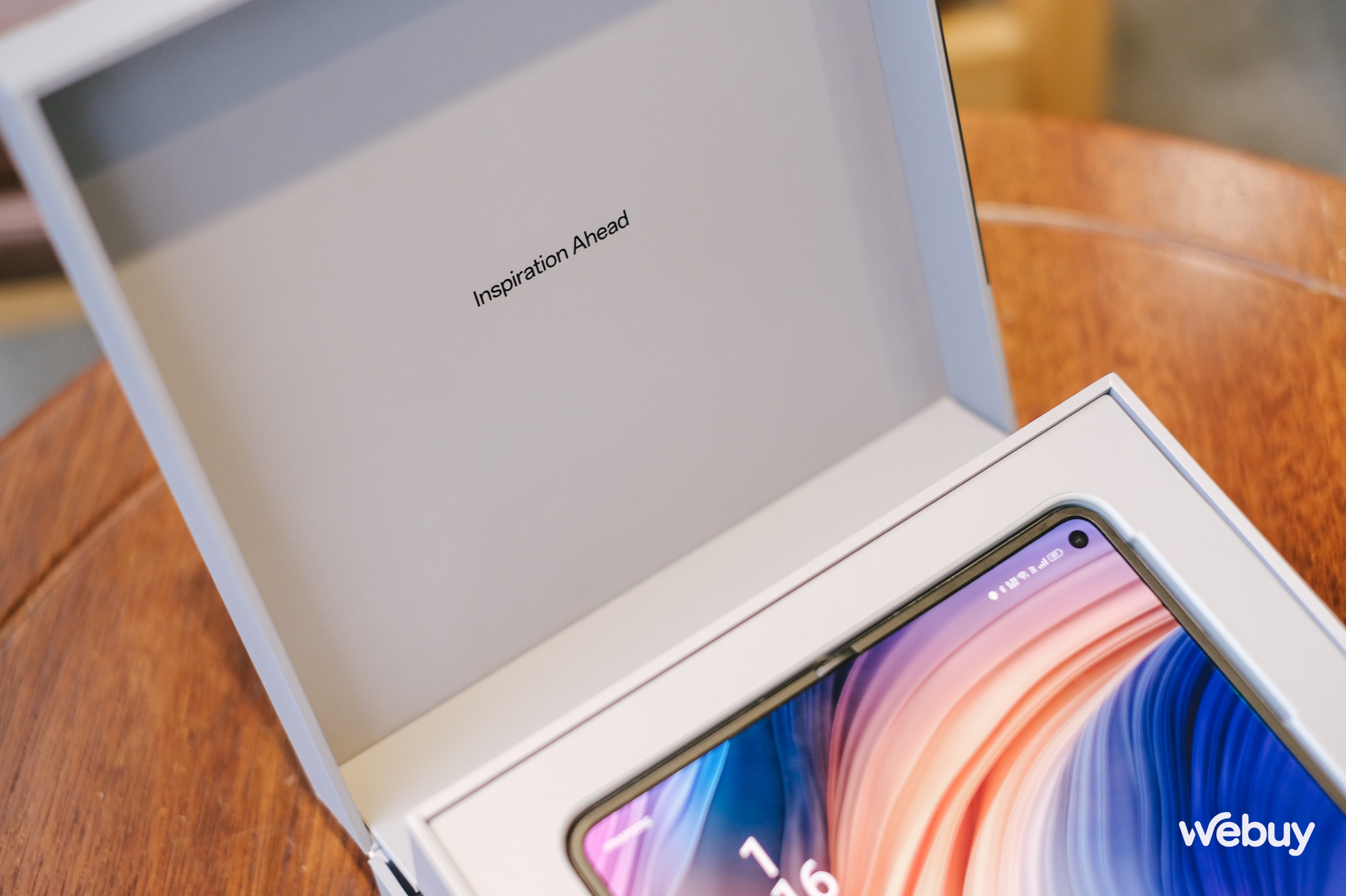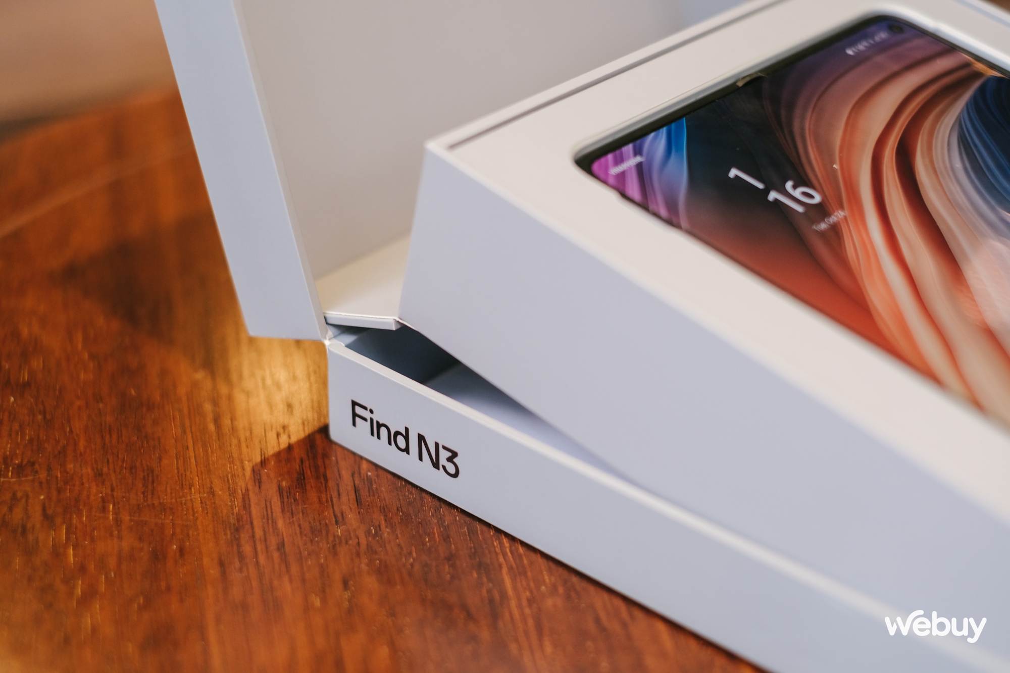 Vỏ hộp cũng sử dụng kiểu thiết kế gập mở mang đặc trưng riêng của dòng sản phẩm màn hình gập. Khi mở ra người dùng sẽ thấy ngay chiếc Find N3 đầu tiên
