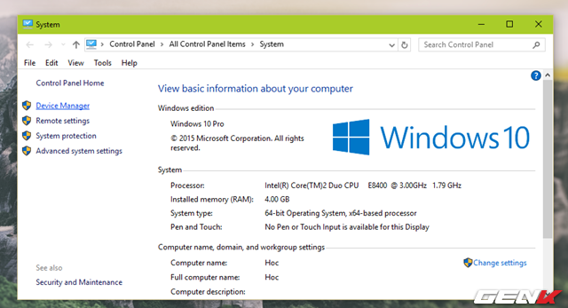 Hộp thoại System xuất hiện, bạn hãy nhấp vào tùy chọn Device Manager ở bên trái.