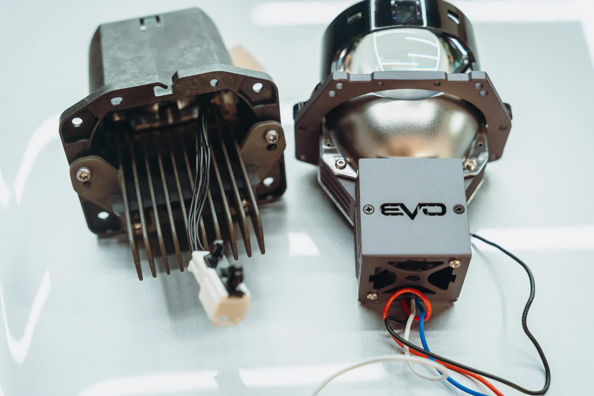 Chất lượng hoàn thiện đèn cũng được đánh giá là rất tốt. Phần khung của projector làm bằng kim loại chắc chắn, tản nhiệt phía sau cũng khá lớn. Hình ảnh so sánh đèn nguyên bản với đèn độ của thương hiệu EVO xếp bên cạnh cũng cho thấy mức độ hoàn thiện của projector trên VF 8 tốt thế nào. Tuy nhiên, thiết kế của đèn độ lại cho chất lượng ánh sáng tốt hơn rất nhiều. Đó là 1 trong 2 giải pháp được anh Chiến đưa ra để cải thiện chất lượng chiếu sáng trên VF 8.