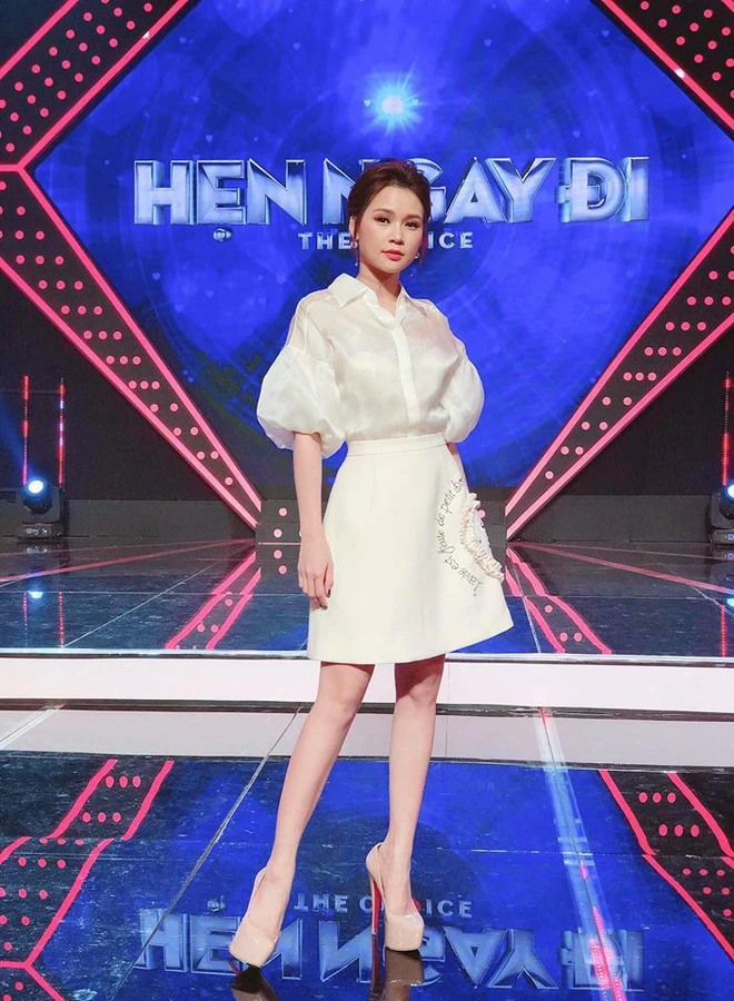 Diện áo sơmi voan tay bồng với chân váy ngắn thêu đính, Hoa hậu Tiểu Vy đã hoàn toàn chinh phục công chúng.