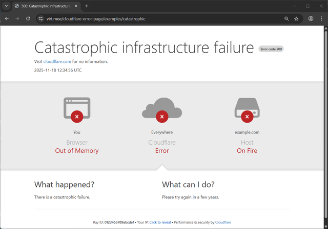 Điểm hài hước nhất là phần hướng dẫn cho lập trình viên. Python có thể render trang lỗi với vài dòng code, Node.js cũng dùng được. PHP được ghi chú "coming soon" như thể tác giả biết cộng đồng PHP là nhóm kiếm chuyện troll đồng đội nhanh nhất. Bên dưới là cả bộ ví dụ mang tính châm biếm nhẹ nhàng. Một mẫu có tiêu đề "Catastrophic infrastructure failure" mô tả trình duyệt hết bộ nhớ, Cloudflare lỗi mọi nơi, còn host thì "On Fire". Phần gợi ý cho người dùng là "Vui lòng thử lại trong vài năm".