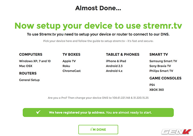 Bước 3: Nhấn nút "I'm Done" để hoàn tất quá trình đăng ký tài khoản. Sau khi đăng ký, bạn cần truy cập vào đây để xem hướng dẫn cài đặt DNS cho từng loại thiết bị cụ thể. Trong bài viết này chúng tôi sẽ hướng dẫn cài đặt DNS trên hai thiết bị được sử dụng nhiều, đó là máy tính Mac chạy OSX và máy tính Windows.