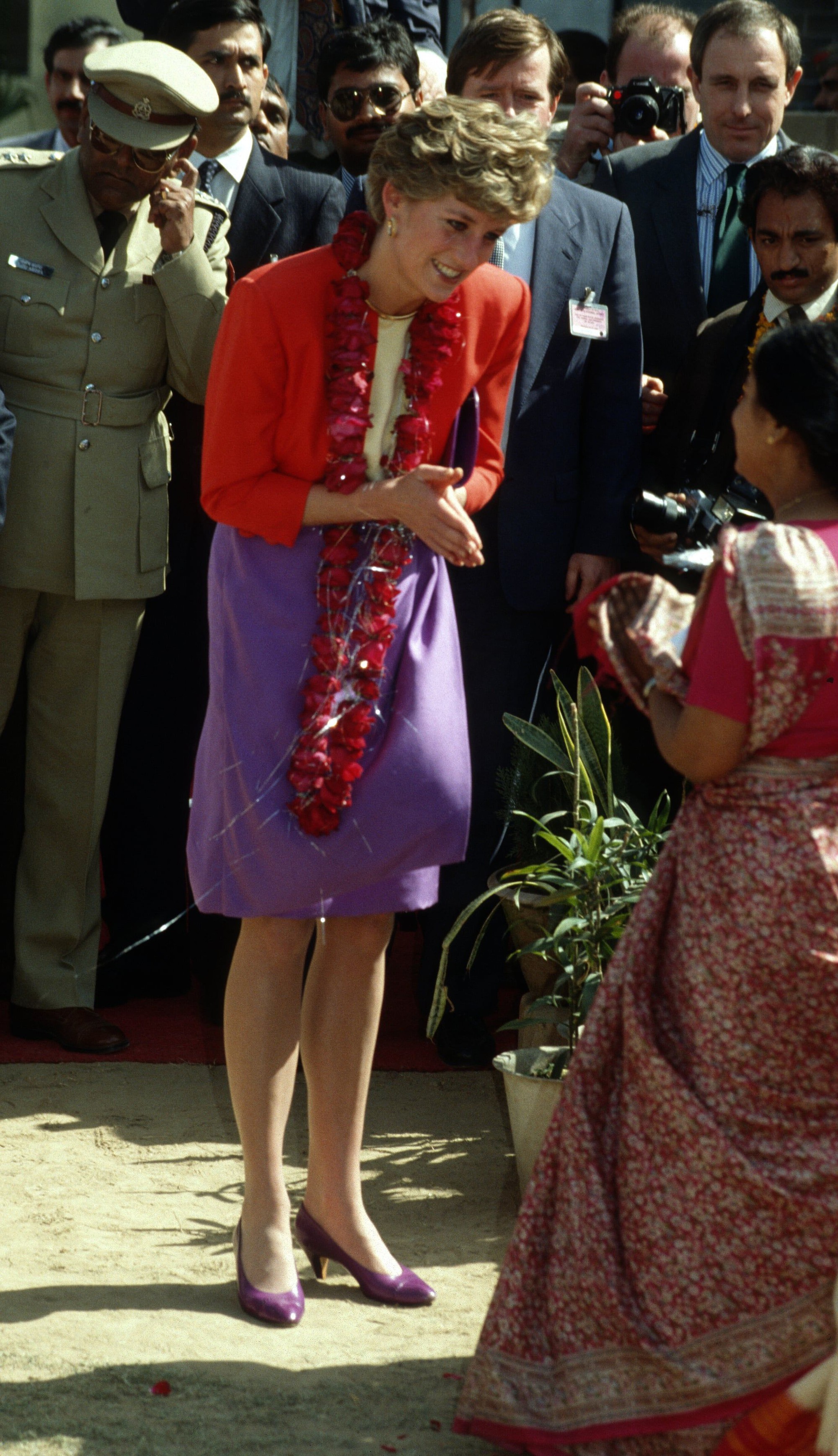 Táo bạo hơn và cũng thể hiện gu thời trang đỉnh cao của Công nương Diana chính là những bộ cánh mix&match giữa 2 gam màu đỏ - tím hay tím - hồng đậm vốn được coi là những bộ đôi tối kỵ để "cặp kè" với nhau. Tuy nhiên, khi được Công nương Diana diện lên mình, người ta chỉ thấy khí chất sang trọng, đẳng cấp toát lên chứ chẳng có chút gì là sến sẩm, khoa trương; biểu tượng phong cách huyền thoại cứ thế mà tỏa sáng rực rỡ trong lựa chọn thời trang táo bạo của mình.