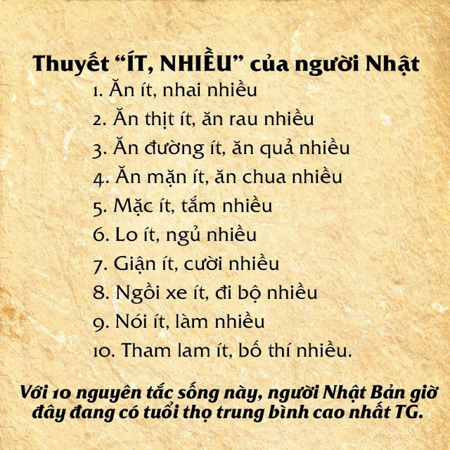 Người Nhật không có điểm gì khác biệt so với mọi người trên thế giới. Tuổi thọ của người Nhật ngày càng cao nhờ mức sống và thói quen tốt, phòng chống bệnh tật hiệu quả, có những tiến bộ vượt bậc trong y học, giảm bớt tai nạn và không có chiến tranh.