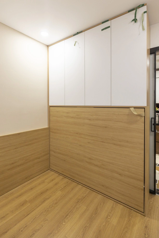"Ban đầu mình sử dụng những hệ phụ kiện nhưng không phù hợp lắm. Cái giường có sức nặng tương đối lớn, trong khi hệ giường và tủ thì nằm cách tường 1 đoạn, phải có phương án gia cố cẩn thận, nếu không toàn bộ hệ đó sẽ đổ xuống", KTS Phan Hùng chia sẻ. Tuy nhiên, may mắn thay, sau khi làm việc đến nửa đêm, KTS Phan Hùng cũng như đội thi công đã có thể bàn giao nhà cho gia đình anh Bách.