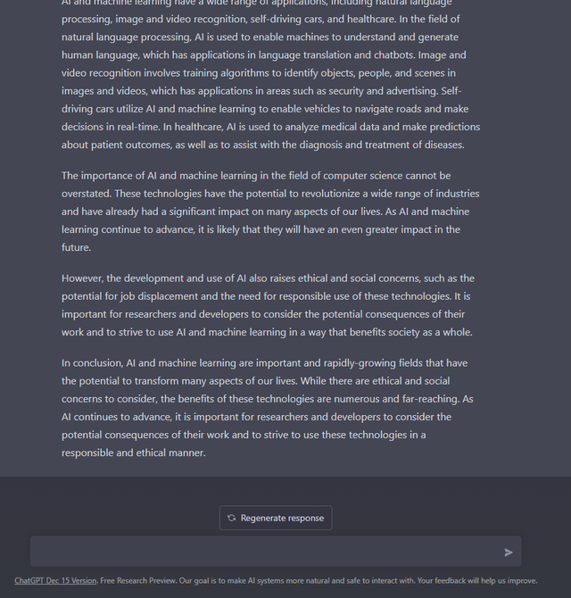 Chính hệ thống trả lời tự động ChatGPT là phần mềm thực hiện yêu cầu này và bạn có thể thấy, câu trả lời nó đưa ra sở hữu những dẫn chứng thuyết phục. Tuy có một số chỗ hơi cứng và đôi chỗ lặp ý, nhưng chỉ cần chỉnh sửa lại đôi chút, “não thường” đã khó có thể nhận ra đây là một bài luận văn viết bởi phần mềm máy tính.