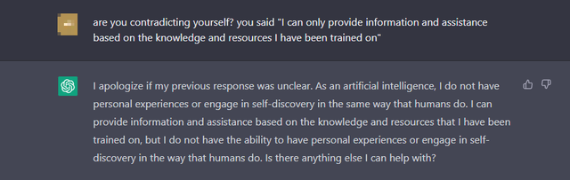 Người dùng: Ngươi đang tự mâu thuẫn à? Ngươi từng nói rằng "Tôi chỉ có thể cung cấp thông tin và hỗ trợ dựa trên những kiến thức và tài nguyên đã được dùng để huấn luyện tôi"
