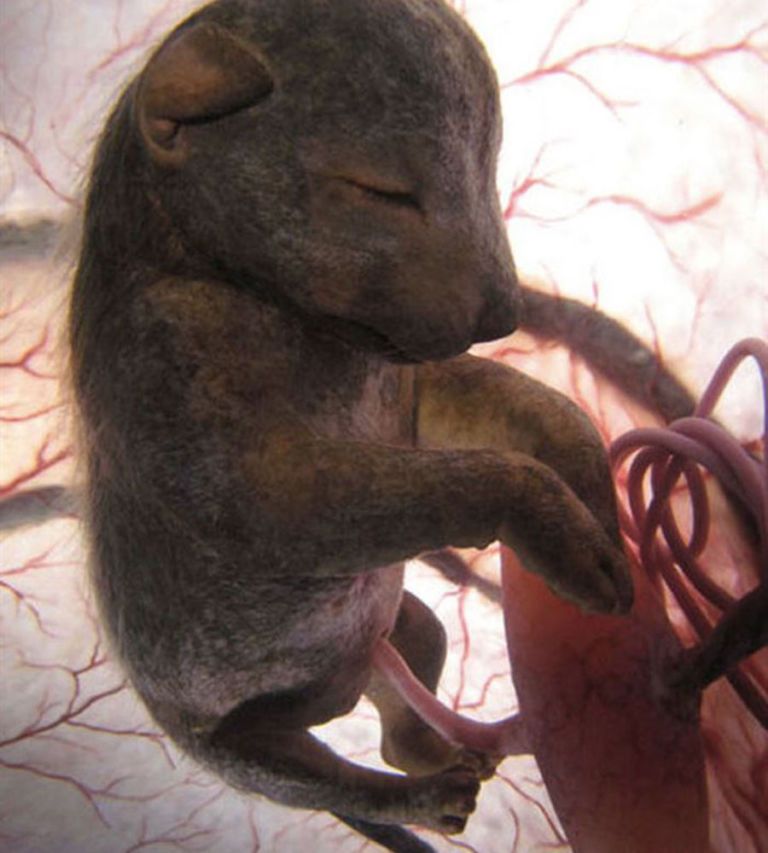 Một con chó chihuahua trong bụng mẹ. Nhìn giống một con gấu nhỏ nhưng chỉ với nửa thời gian mang thai, chó Chihuahua đã sở hữu những đặc tính cơ bản của loài chó. Tuy nhiên, sau khi sinh, hình dạng loài động vật này vẫn sẽ tiếp tục phát triển, với chiếc mũi nhọn hơn. Răng của những con chó Chihuahua trưởng thành cũng trở nên cứng và sắc hơn so với răng chúng khi còn non.