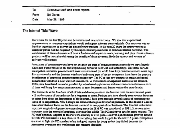 "Việc thay đổi chiến lược - cho phép văn bản của Office tương thích tốt với các trình duyệt khác - là một trong những điều hủy hoại công ty. Chúng tôi dừng mọi cố gắng vào việc đó và chắc chắn rằng văn bản của Office phụ thuộc vào sự tương thích với IE", Gates viết về Microsoft năm 1998.