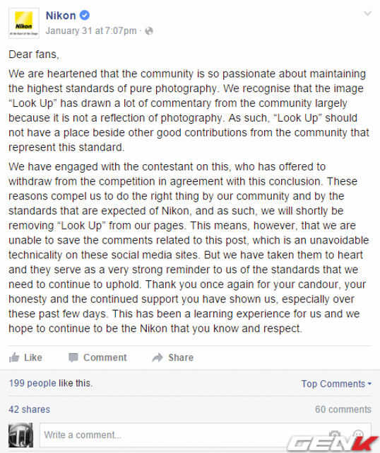 Nikon sau đó cũng đã có phản hồi về vấn đề này, họ đã đăng tải lời xin lỗi lên trang Facebook nơi đã từng vinh danh trao giải bức ảnh này: