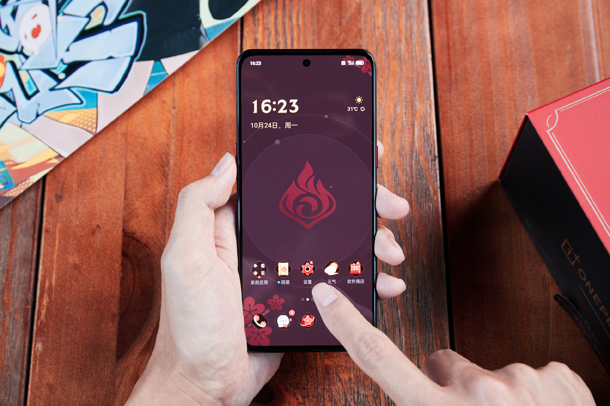 Phụ kiện đi kèm cũng độc đáo không kém, gồm đèn ngủ, quạt tản nhiệt, ốp lưng bảo vệ, que lấy sim hình Trượng Hộ Ma, stickers và các Nguyên Thạch, bên cạnh đó là củ sạc và cáp sạc cũng được thiết kế tông màu đỏ đặc trưng.