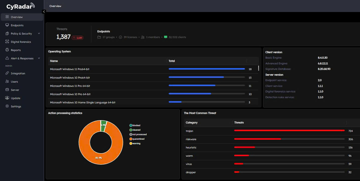 Bảng điều khiển quản trị CyRadar EDR với thống kê hệ điều hành, số lượng mối đe dọa, tình trạng xử lý và nhóm mối nguy phổ biến, hỗ trợ quản lý tập trung cho doanh nghiệp.