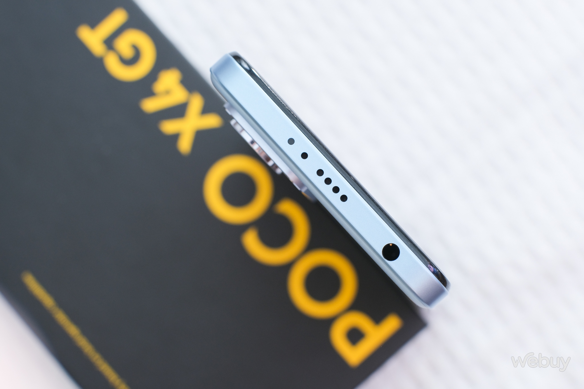Khung viền này của POCO X4 GT được thiết kế vuông vắn, nơi đặt các cổng kết nối cũng như phím bấm vật lý. Nút nguồn có tích hợp sẵn cảm biến vân tay một chạm. Ngoài ra máy vẫn có "mắt thần" hồng ngoại ở cạnh trên dùng để điều khiển các thiết bị gia dụng