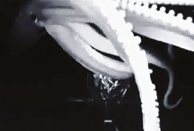 Đây là một con mực khổng lồ bị thu hút bởi mồi nhử dưới máy ảnh vài mét và bị mắc kẹt ở giữa. Nó vật lộn để phá lưỡi câu trong gần 4 giờ, và phải để lại một xúc tu dài 5 mét để thoát khỏi bẫy. Mọi người thường nghĩ rằng động vật chân đầu rất yếu đuối và dễ bị tổn thương, nhưng họ đã nhầm, sinh vật này rõ ràng rất hung dữ và có sức kháng cự cực kì lớn.