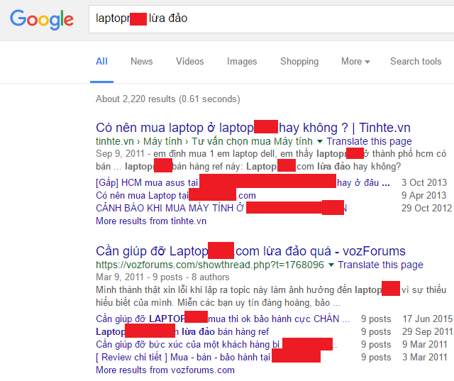 Nhấn Enter và tôi thấy hàng chục kết quả đáng lo ngại. Một vài đường dẫn cho thấy cửa hàng này đã cố gắng giải quyết vấn đề, nhưng rõ ràng là nếu có tới hàng chục kết quả lừa đảo trong trang tìm kiếm đầu tiên thì tôi cần phải tránh xa cửa hàng này. Thậm chí, ngay cả khi chỉ tìm kiếm với từ khóa là tên cửa hàng (không có cụm "lừa đảo") mà vẫn ra được các kết quả cảnh báo.