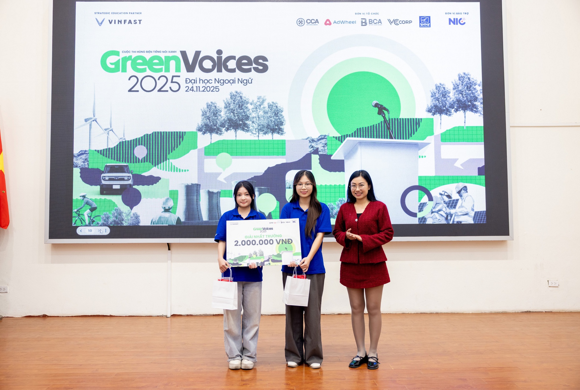 Green Voices 2025 là cuộc thi hùng biện nằm trong chuỗi “Hành trình giáo dục chuyển đổi xanh”, do VCCorp phối hợp cùng Trung tâm Đổi mới sáng tạo Quốc gia (NIC) tổ chức, với VinFast là đối tác giáo dục chiến lược. Tại mỗi điểm trường, Green Voices mang đến sân chơi học thuật để sinh viên thể hiện bản lĩnh lập luận, tư duy phản biện và góc nhìn riêng về các vấn đề môi trường, giao thông xanh, lối sống bền vững.
