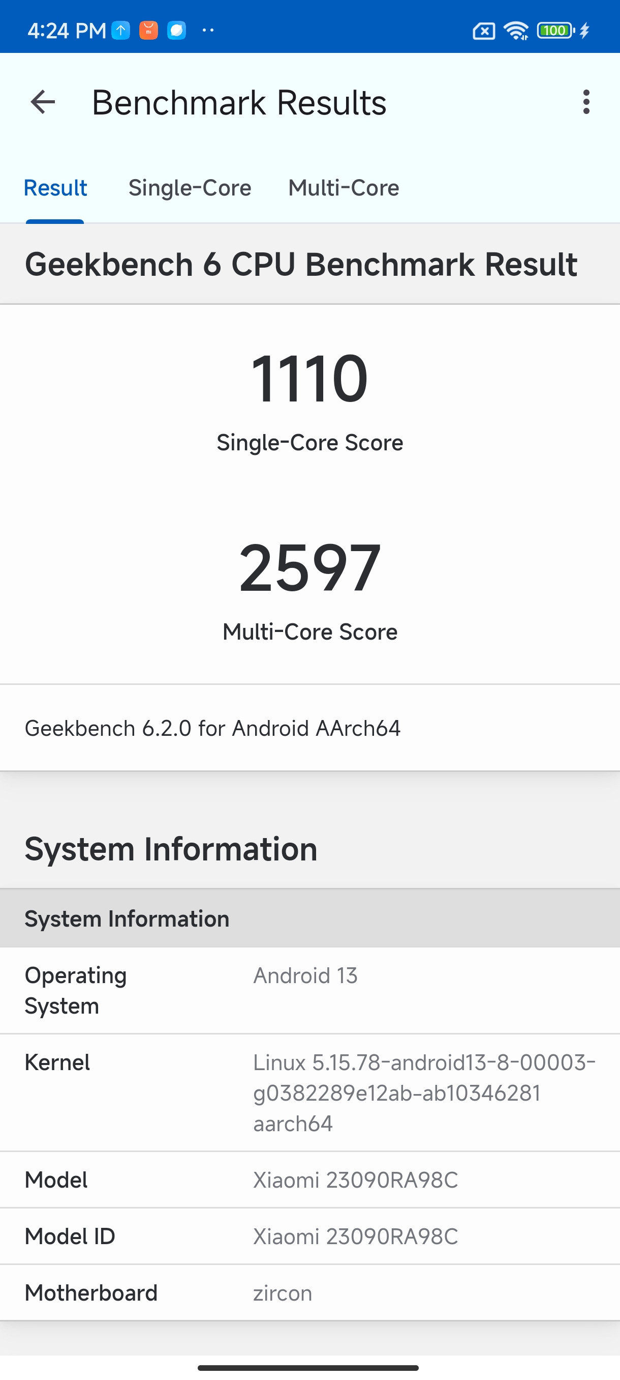 Điểm hiệu năng của con chip Dimensity 7200 Ultra trên Redmi Note 13 Pro+ khi chấm điểm bằng phần mềm AnTuTu Benchmark và Geekbench. Điểm số này dư sức chơi mượt đa số tựa game phổ biến hiện nay ở mức đồ hoạ trung bình trở lên