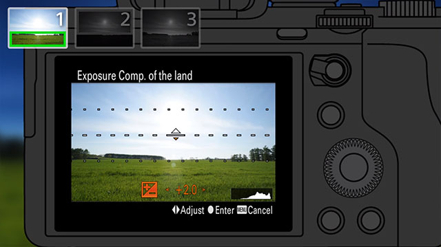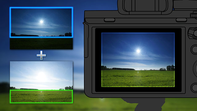 Bên cạnh đó, người dùng cũng có thể tự do điều chỉnh cân bằng trắng (White Balance), tốc độ màn trập và khẩu độ cho từng vùng. Ví dụ giảm tốc độ màn trập của vùng đồng cỏ cho sáng hơn và tăng tốc độ màn trập vùng trời để không bị cháy. Theo cơ chế thì máy ảnh sẽ chụp 2 tấm ảnh riêng biệt và ghép lại cho người dùng, hỗ trợ cả ảnh JPEG lẫn ảnh RAW.