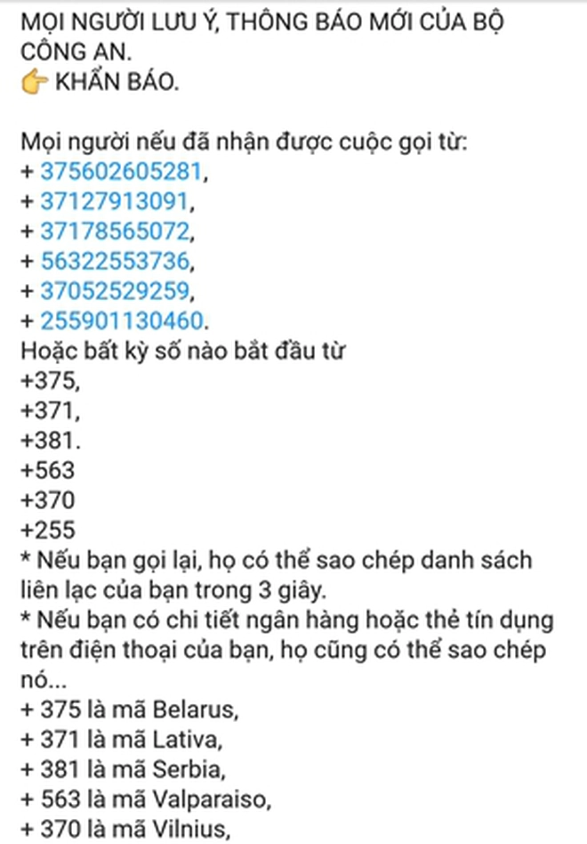 "MỌI NGƯỜI LƯU Ý, THÔNG BÁO MỚI CỦA BỘ CÔNG AN. KHẨN BÁO. Mọi người nếu đã nhận được cuộc gọi từ: + 375602605281, + 37127913091, + 37178565072, + 56322553736, + 37052529259, + 255901130460. Hoặc bất kỳ số nào bắt đầu từ +375, +371, +381, +563 +370 +255 * Nếu bạn gọi lại, họ có thể sao chép danh sách liên lạc của bạn trong 3 giây. * Nếu bạn có chi tiết ngân hàng hoặc thẻ tín dụng trên điện thoại của bạn, họ cũng có thể sao chép nó... + 375 là mã Belarus, + 371 là mã Lativa, + 381 là mã Serbia, + 563 là mã Valparaiso, M370 là mã Vilnius, + 255 là mã Tanzania. Các cuộc gọi này có thể theo ISIS... nên: + Không trả lời, + Hoặc gọi lại. Ngoài ra: + Không thao tác #90, #09 trên Điện thoại di động của bạn khi được người gọi đề nghị. Đây là một thủ thuật mới của khủng bố để truy cập vào thẻ SIM của bạn. Thực hiện các cuộc gọi bằng chi phí của bạn và khủng bố bạn như một tội phạm. Vì vậy, mọi người chia sẻ chuyển tiếp tin nhắn này cho bạn bè, người thân... của bạn để ngăn chặn nó trước khi quá muộn. Công nghệ càng phát triển thì các hoạt động khủng bố và lừa đảo càng tinh vi, mọi người hết sức cảnh giác", sự việc trên lan truyền trên mạng xã hội Facebook gây ra tâm lý hoang mang, lo lắng cho nhiều người dân.
