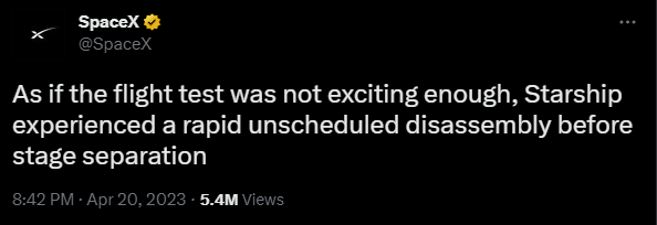 Dường như buổi bay thử vẫn chưa đủ thú vị, trước khi kịp rời phần tên lửa đẩy thì tàu Starship đã trải qua quá trình tháo rời nhanh mà không báo trước.
