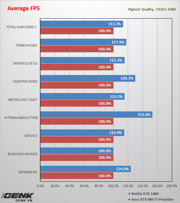 Có vẻ như độ phân giải Full HD không thể phô diễn được hết sức mạnh của GTX 1080, chênh lệch khung hình so với chiếc Asus GTX 980 Ti Poseidon rất không ổn định. Con quái thú này sinh ra không dành cho các màn hình dưới 2K.