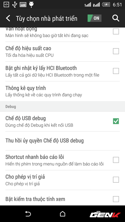 Sau khi đã xuất hiện Tùy chọn nhà phát triển trong Cài đặt, bạn hãy truy cập vào nó và đánh dấu vào tùy chọn Chế độ USB debug.