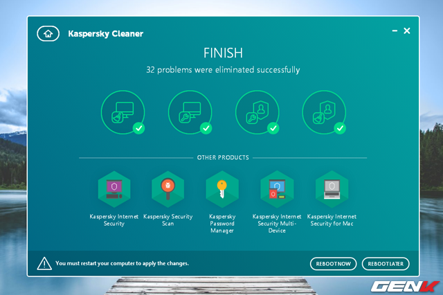 Sau khi quá trình khắc phục được hoàn thành, bạn sẽ được yêu cầu khởi động lại hệ thống. Tuy nhiên bạn có thể lựa chọn khởi động lại sau (Reboot Later).