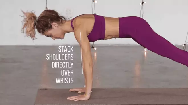 - Khuỷu tay thẳng, đùi hông nâng lên. Giữ đầu, cột sống và chân thẳng hàng trên một đường thẳng.