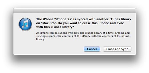 Một trong những thông báo đáng sợ nhất mà người dùng iPhone, iPad từng gặp phải khi kết nối thiết bị của mình với máy tính là thông báo "The iPhone (Name) is synced with another iTunes Library on (Computer). Do you want to erase this iPhone and sync with this iTunes Library?". Trong bảng thông báo chỉ có 2 lựa chọn, Hủy bỏ hoặc Xóa và Đồng bộ.