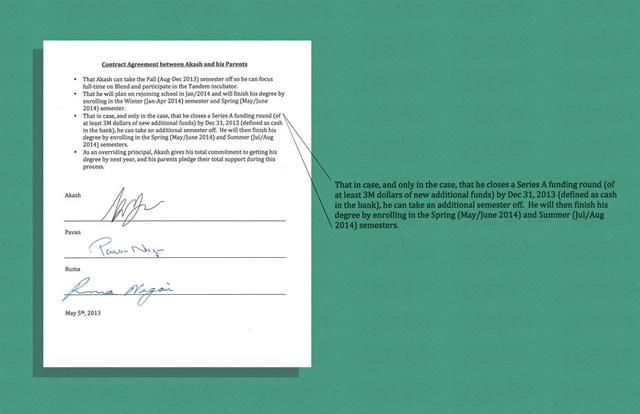 Nội dung của hợp đồng gồm các lựa chọn như cho phép Akash hoãn việc học trong 1 kỳ để tập trung cho ứng dụng Blend. Hoặc nếu Akash có thể huy động thành công 3 triệu USD trong vòng 6 tháng, anh ấy có thể nghỉ học trong thời gian lâu hơn.