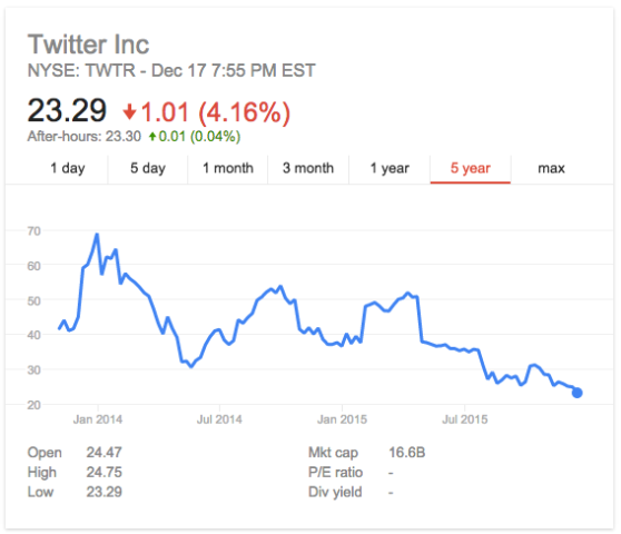 Mạng xã hội Twitter vẫn đang gặp phải rất nhiều khó khăn, ngay cả khi đã có một CEO mới chính là đồng sáng lập Jack Dorsey. Trong phiên giao dịch hôm thứ 5, giá cổ phiếu của Twitter đã giảm 5%, kết thúc ở mức giá 23,32 USD/cổ phiếu và là mức thấp nhất từ trước đến nay khi đóng cửa một phiên giao dịch.
