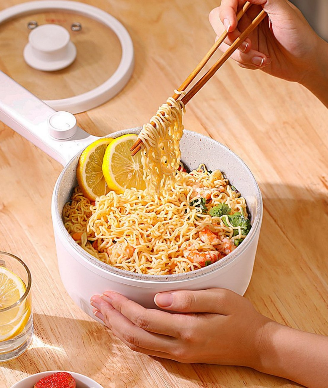 Ví dụ như 2 loại dưới đây từ Lock & Lock và Mishio, dung tích nho nhỏ vừa đủ nấu được bát canh, luộc đĩa rau hay nhúng lẩu “cô đơn”, công suất khá lớn nên đun nước nhanh sôi, có nhiều mức nhiệt để chỉnh. Riêng loại Mishio lòng nồi có phủ lớp chống dính nên còn làm được các món chiên xào rất tiện nhé.