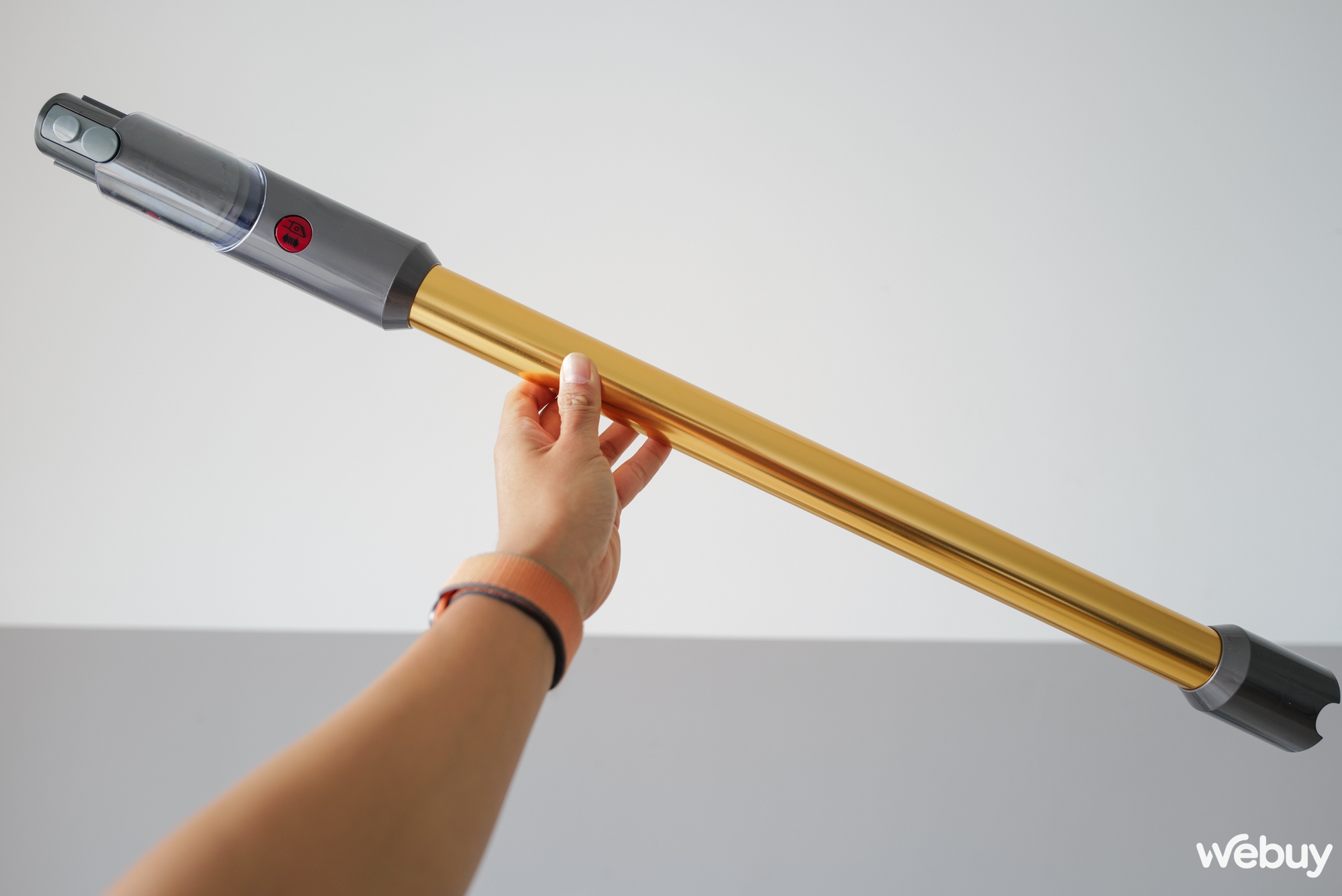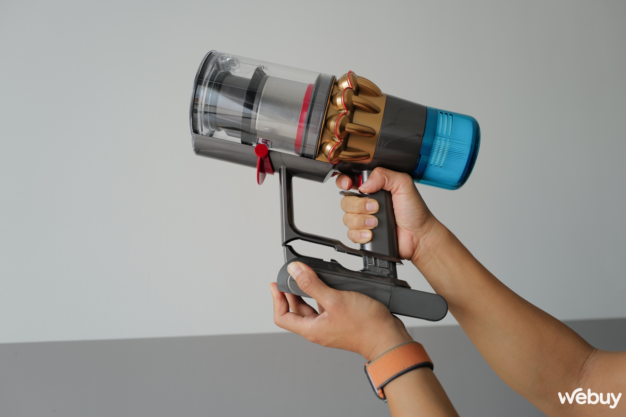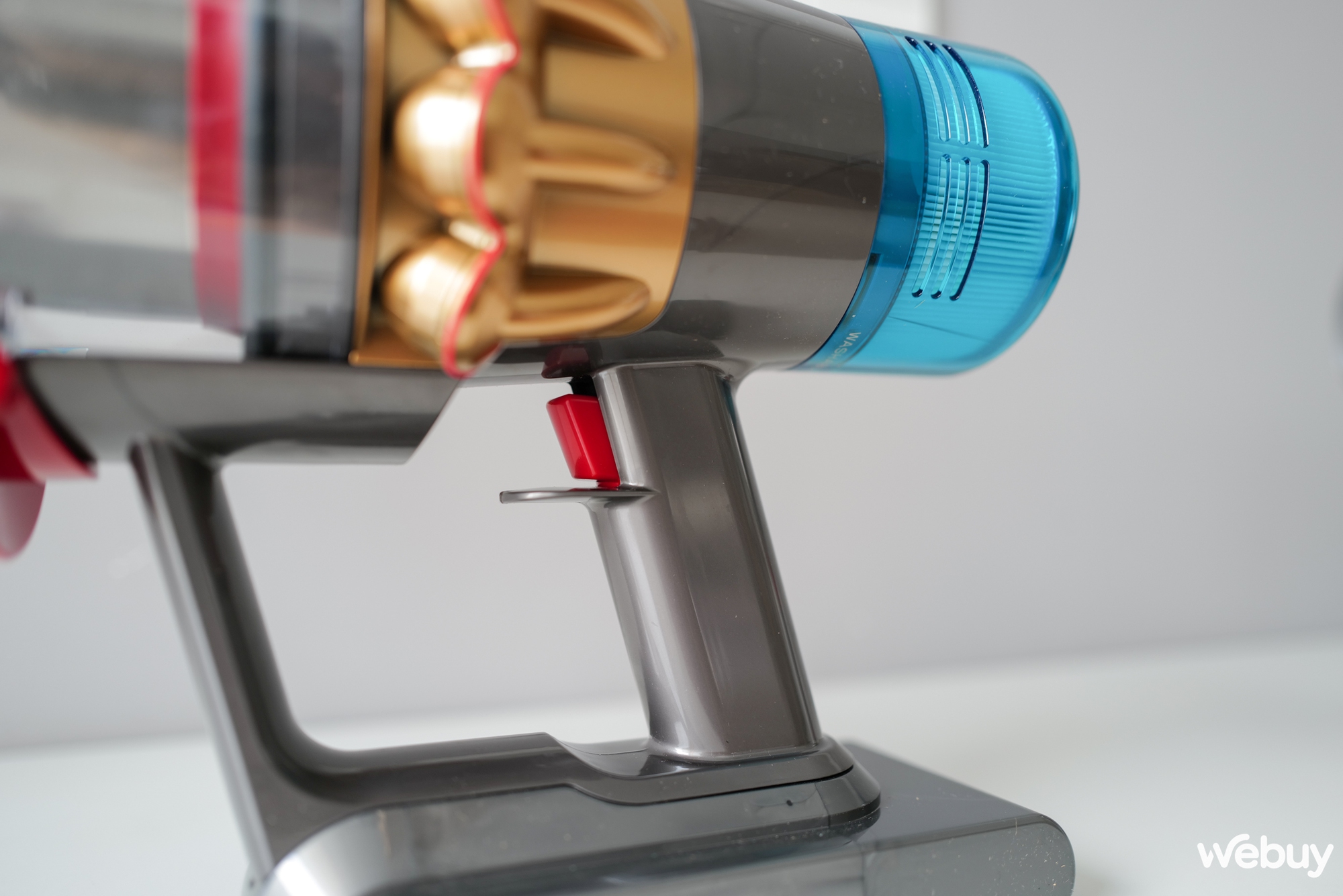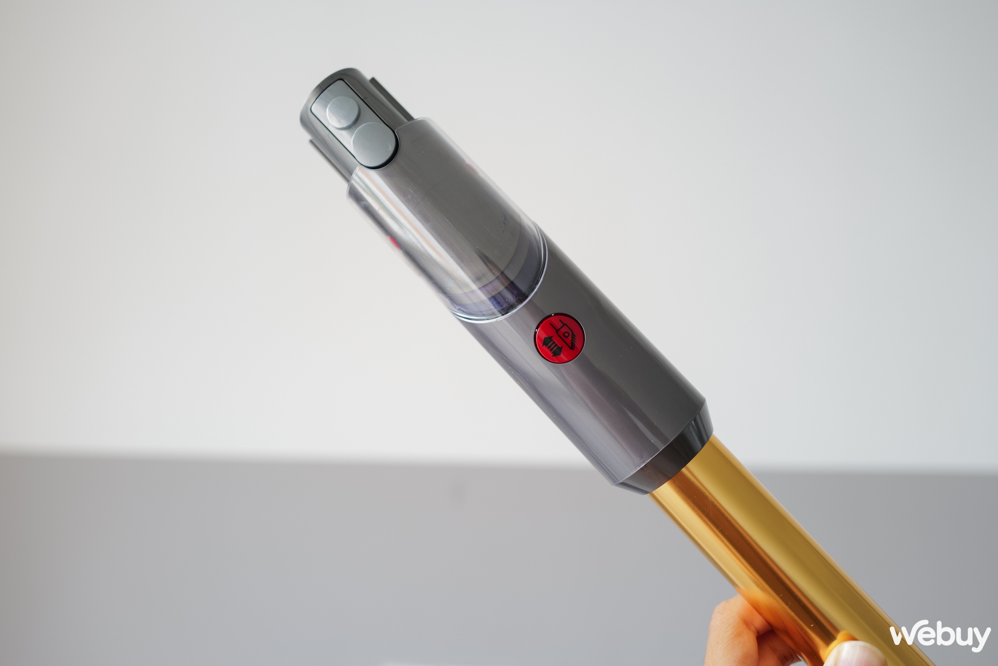 Tiếp đến, khi sử dụng xong thì việc đổ mớ bụi bặm trông cũng rất "ngầu", chỉ cần tháo đầu hút và tiến đến thùng rác, đẩy mạnh phần lẫy đỏ ra là mọi bụi bẩn đều được "tống khứ" đi hết. Cảm giác những ngày chơi súng nhựa thời tuổi thơ bỗng chợt ùa về những lúc thế này…