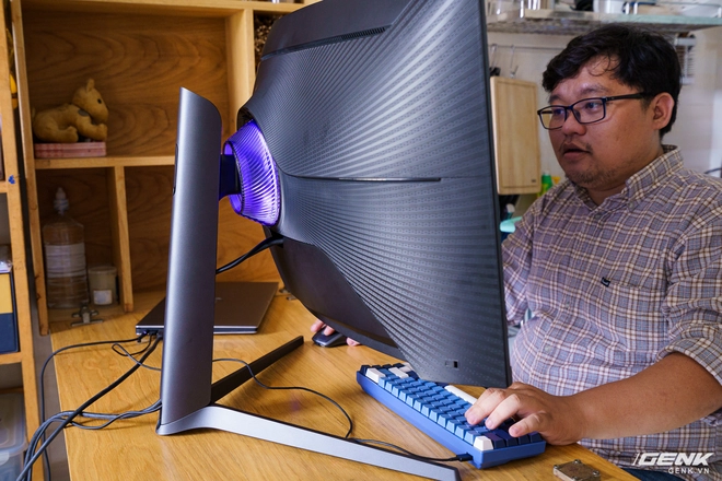 Dù tổng thể không quá hầm hố nhưng Samsung cho thấy sự chăm chút, tạo thêm sự tiện dụng qua các chi tiết nhỏ như giấu dây vào trong chân đế, miếng che cổng kết nối hay phần giá treo tai nghe phía sau, ...