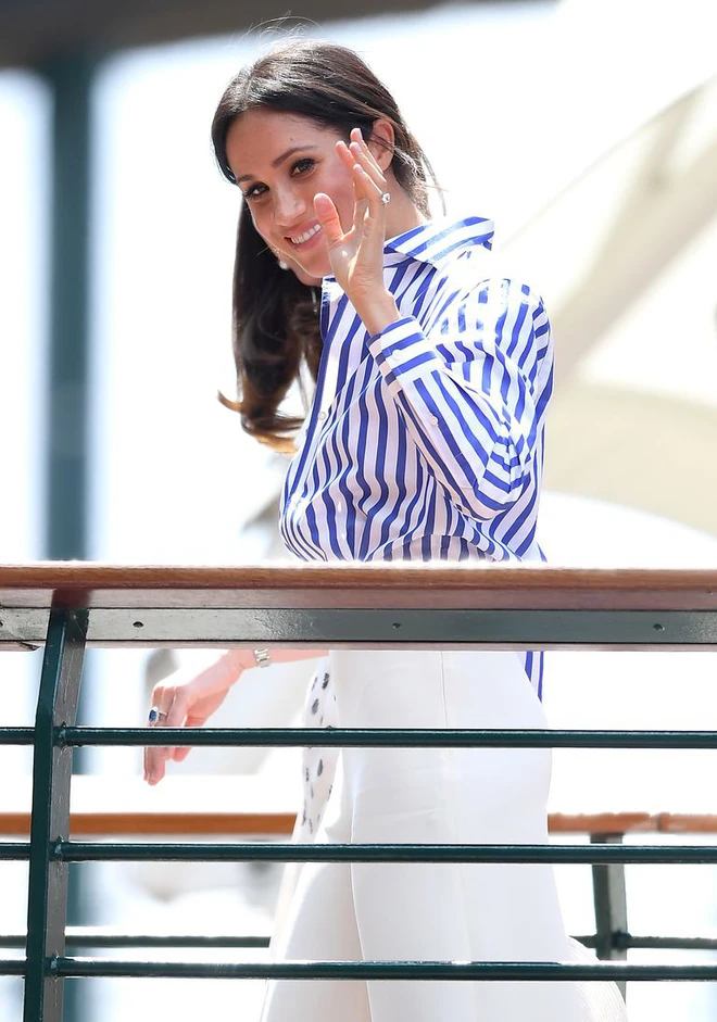 Cuối tuần vừa rồi, Meghan Markle đã tham dự giải quần vợt Wimbledon lần đầu tiên với tư cách là một nhân vật Hoàng gia. Công nương mới của nước Anh đã đi cùng chị dâu Kate Middleton và như thường lệ, tiếp tục ghi điểm với phong cách thời trang thanh lịch của mình. Meghan diện áo sơ mi kẻ sọc trắng xanh kết hợp với quần tây màu trắng đơn giản nhưng rất tinh tế. Được biết, cả cây đồ này đều là thiết kế của thương hiệu Mỹ Ralph Lauren.
