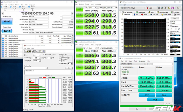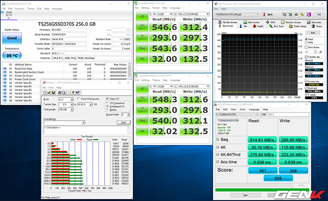 - Đo tốc độ ổ sau khi cài windows, sử dụng chính ổ Transcend SSD370S 256 GB để boot windows và cài phần mềm đo.