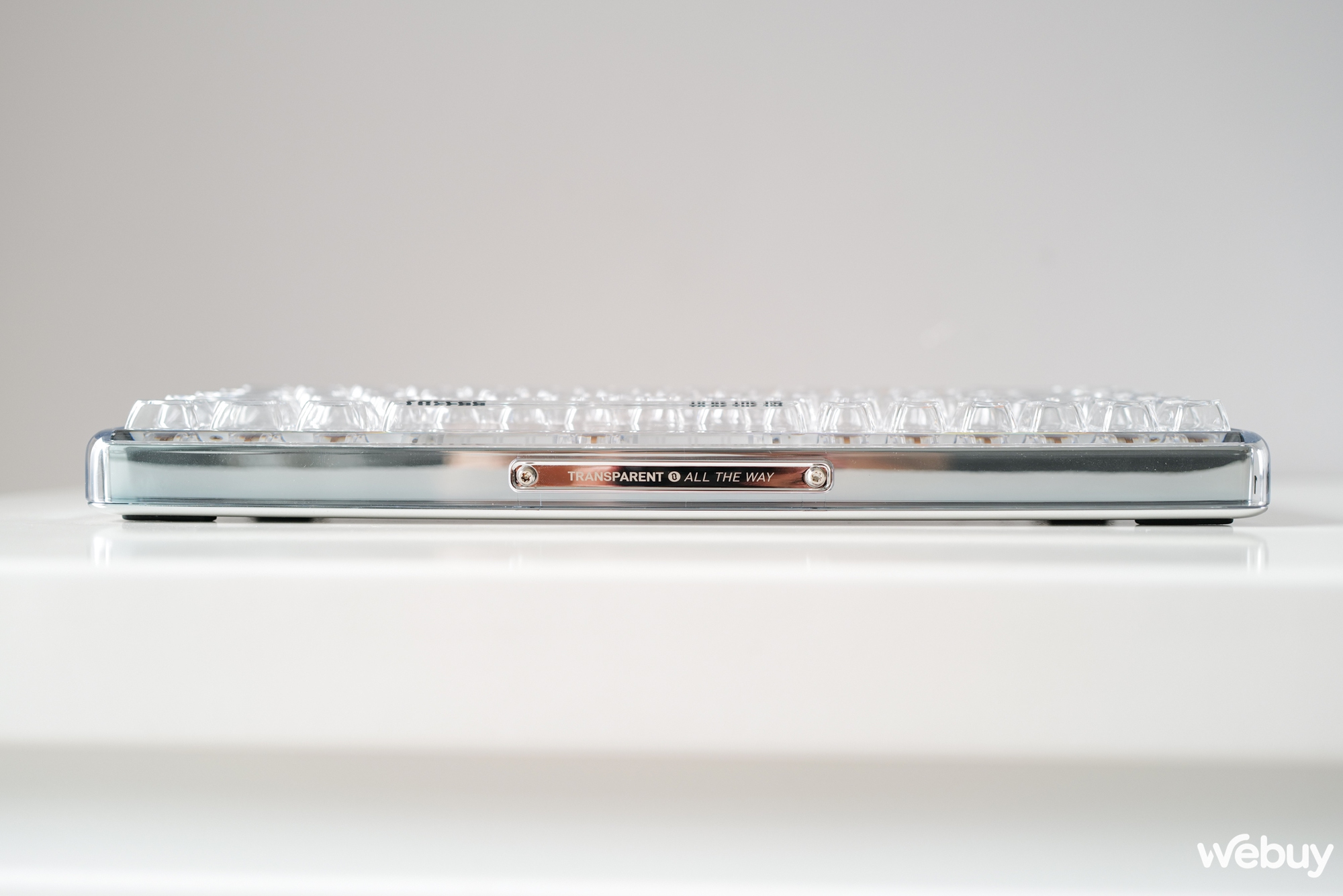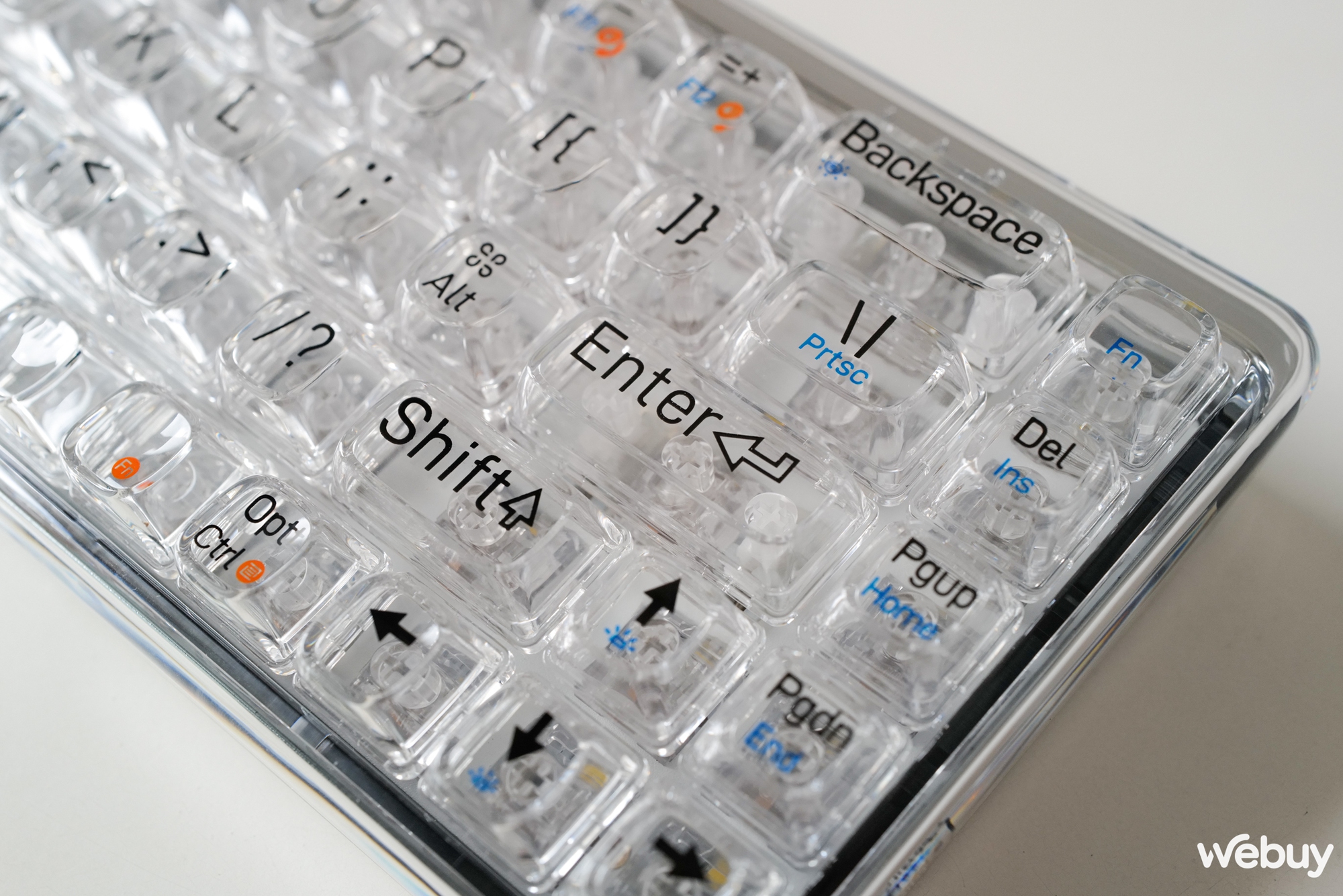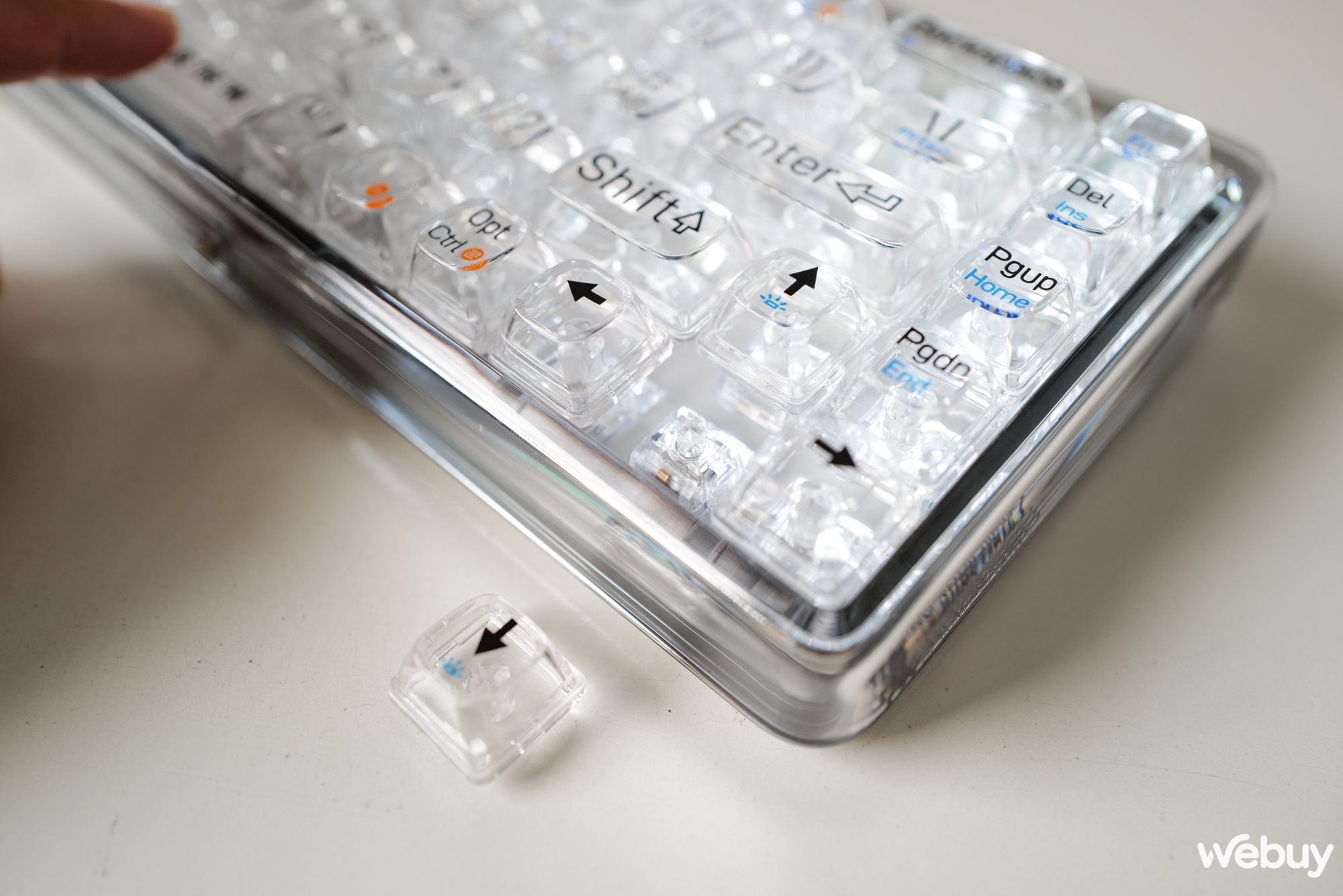 Nhìn gần hơn một chút, bạn sẽ thấy đây là một chiếc bàn phím có thiết kế trong suốt, thậm chí phần switch bên dưới cũng lộ rõ một phần.