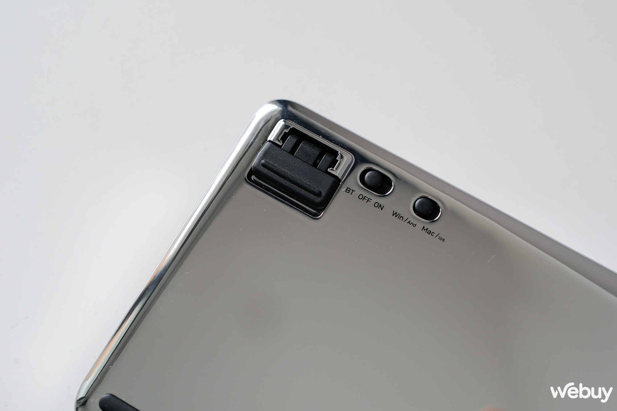 Điểm chưa ưng ý của người viết là lẫy nâng bàn phím chỉ có 1 nấc thay vì 2 như đa số các bàn phím hiện nay. Nút chuyển các chế độ Bluetooth/Nguồn hay dùng cho hệ điều hành Mac/Windows cũng bị đặt xuống đáy nên thao tác ban đầu sẽ hơi có phần cồng kềnh.