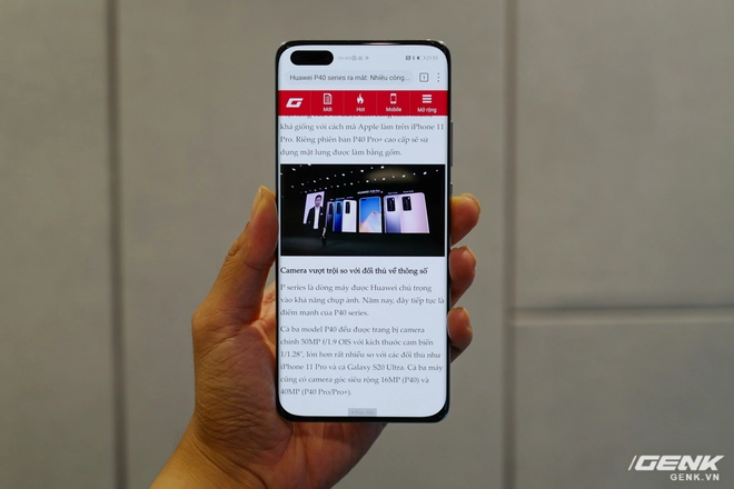 Màn hình P40 Pro có kích thước 6,58 inch OLED (2640 x 1200 pixel), độ làm tươi 90Hz thay vì 120Hz so với một số đối thủ khác trên thị trường. Do thời gian trải nghiệm khá ngắn nên chúng tôi chưa thể đưa ra kết luận nhiều về độ hiển thị của P40 Pro, tuy nhiên cảm nhận ban đầu là màu sắc rất đẹp và góc nhìn cũng rộng.