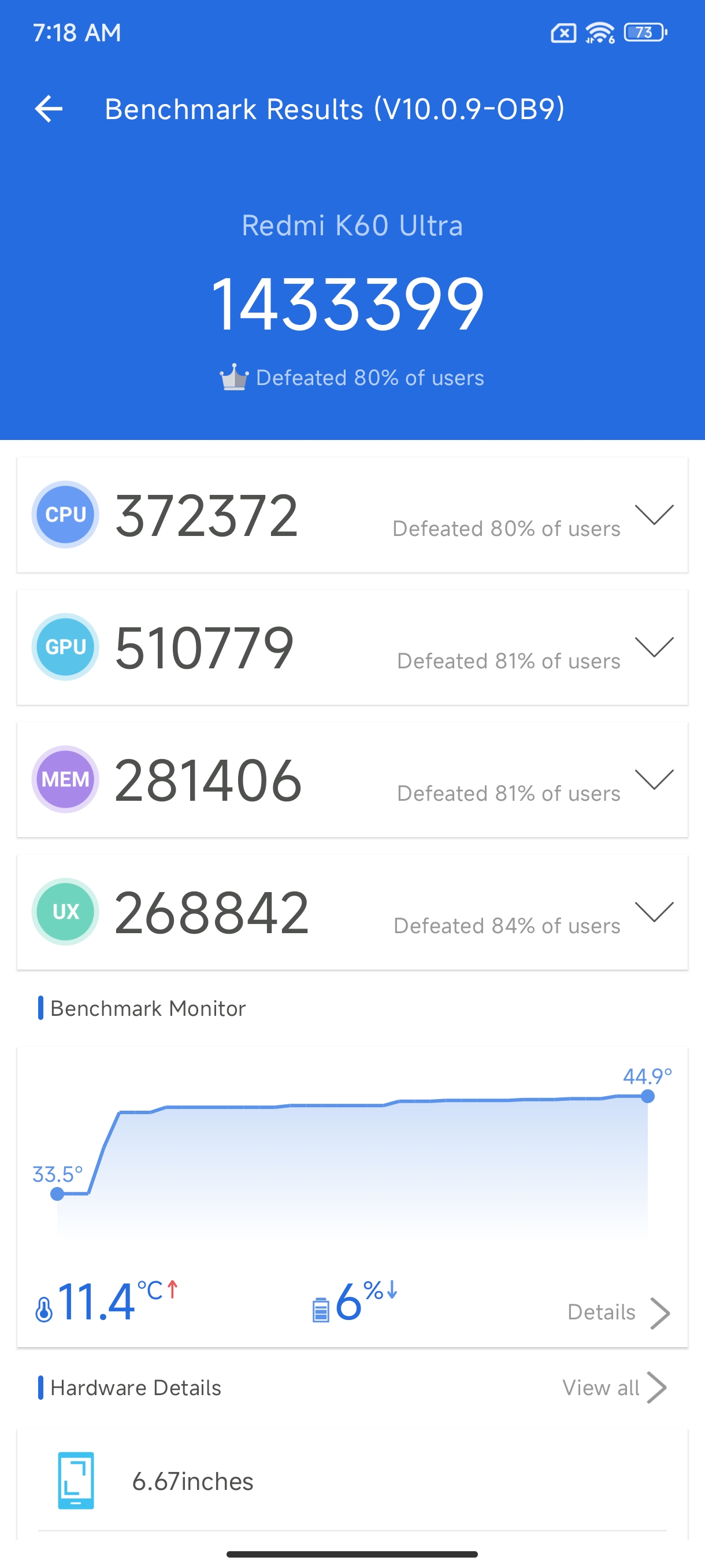 Xiaomi cho biết Redmi K60 Ultra tích hợp con chip X7 được phát triển bới Pixelworks nhằm hỗ trợ chơi game ở độ phân giải 144Hz với 30 tựa game khác nhau. Bởi vậy trong cài đặt màn hình, phần tần số quét được hiển thị là "lên tới 144Hz"